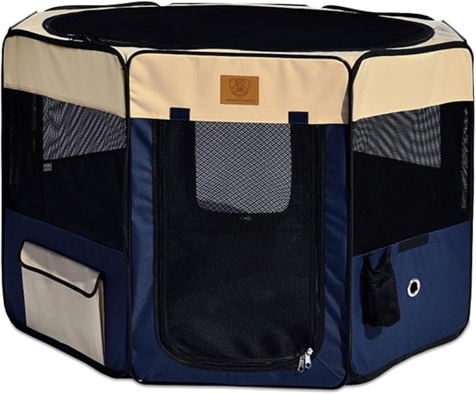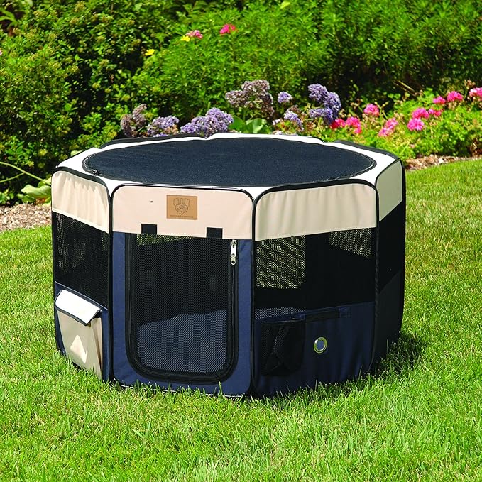 - SOFT SIDE DOG PLAY PEN: Heavy duty playpen for dogs feature zippers, ground stakes, reinforced corners & steel wire framework to keep pets secure. 8 mesh panels provide superior air flow & visibility. Top & bottom panels are removable.