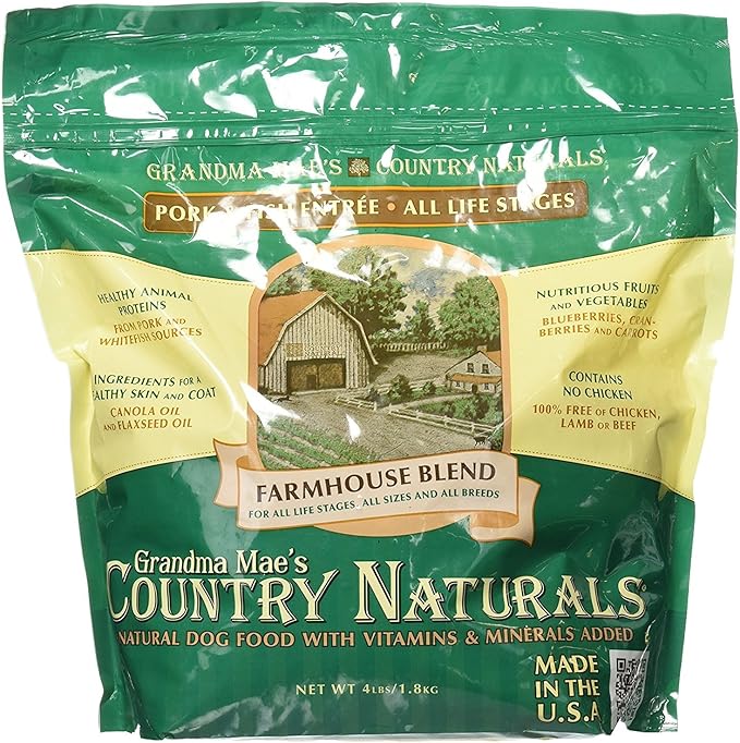 - Contains one (1) 4 lb Bag of Grandma Mae's Farmhouse Blend Adult Dry Dog Food Pork and Whitefish