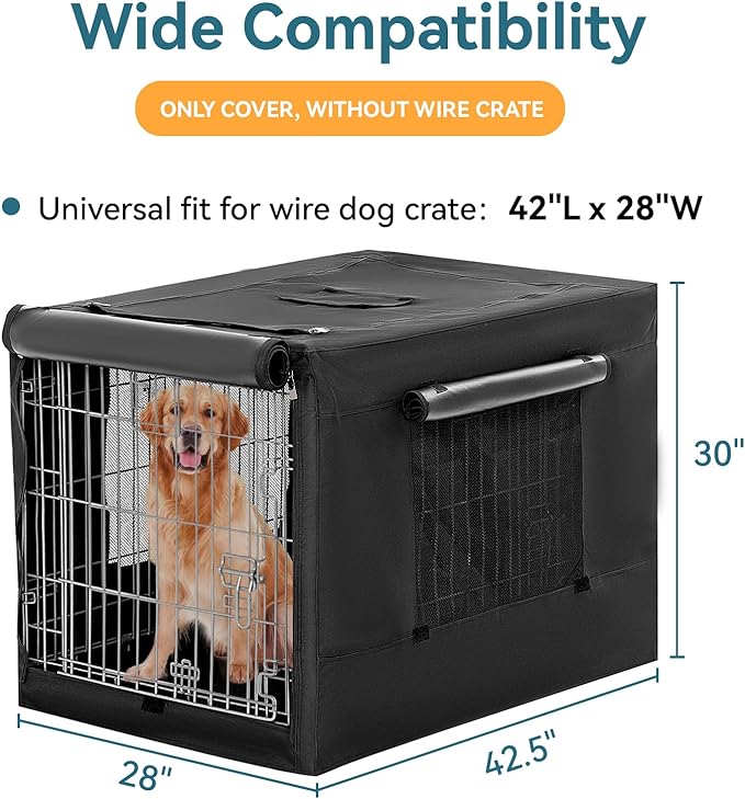 - Size-Our dog crate covers are suitable for iron dog crates of 30 inches, 36 inches, and 42 inches. The black covers are designed for single-door iron dog kennels. All our crate covers come with breathable mesh windows, each equipped with a cover that can be rolled down. Not only can the top be opened, but it also features a flap door, making it convenient to carry by the handle when going out.