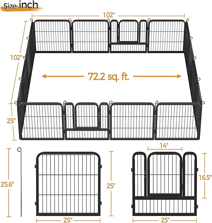 - 16 Panels Playpen: This dog playpen has 16 panels and two of them with a door. Each panel of this versatile dog playpen measures 24.8″ W × 24.8″ H . By connecting them with metal bars, the 16 panels connect together with the long metal stakes to give your pet a decent area for playing and resting