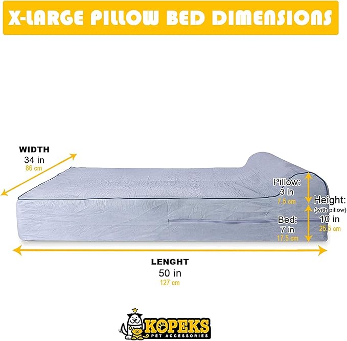 - Compatible with KOPEKS XL Dog Bed. DIMENSIONS: 50”L x 34”W x 7” Thick Memory Foam Plus a 3” Thick Pillow