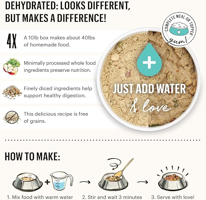 - EASY HOMEMADE MEALS FOR YOUR DOG: Transform our dehydrated food into a complete and balanced meal by simply adding warm water, perfect for busy pet parents wanting high-quality meals without hassle