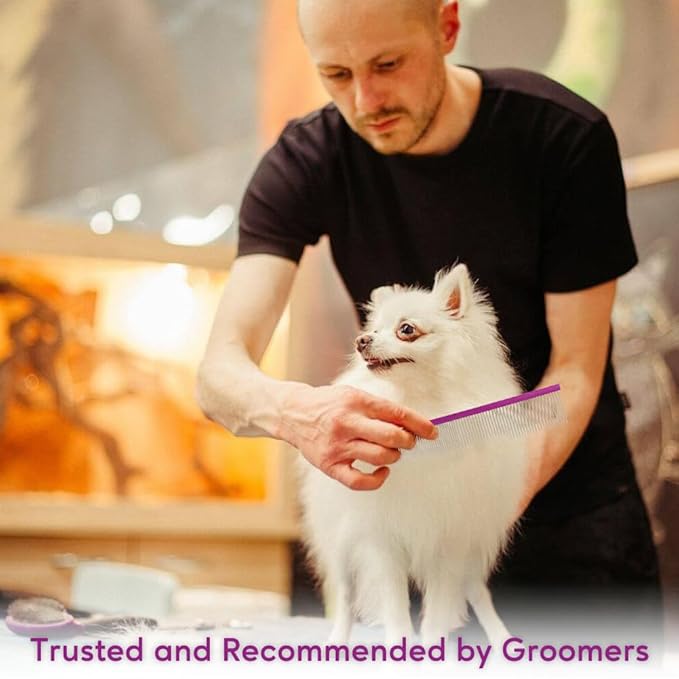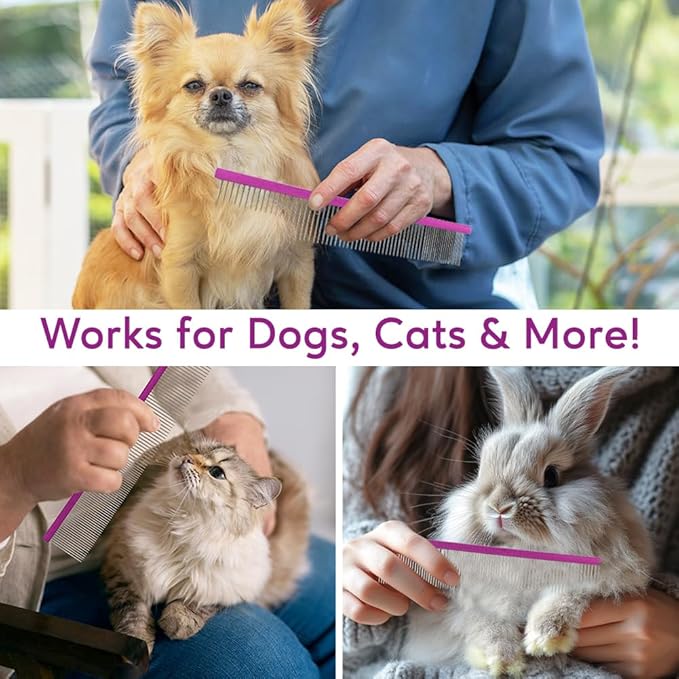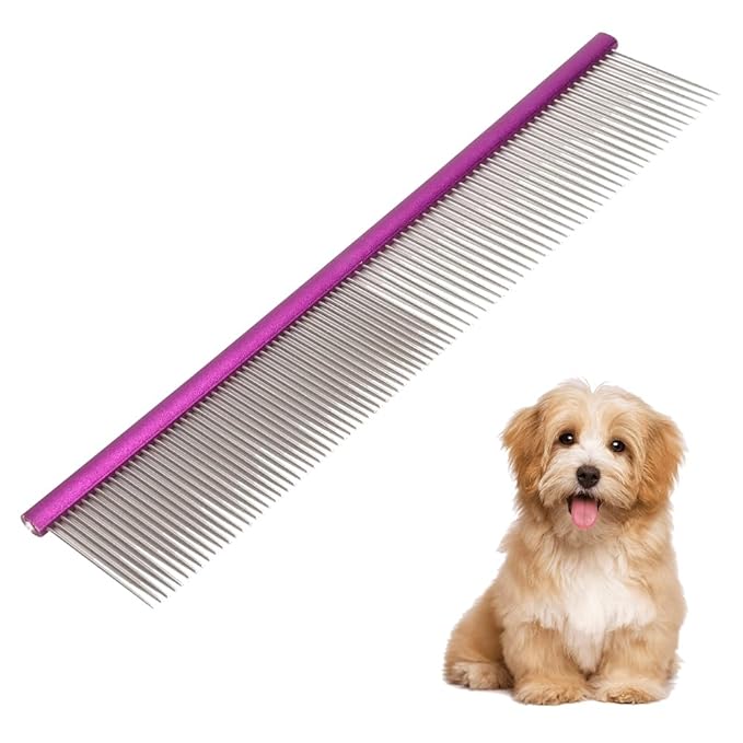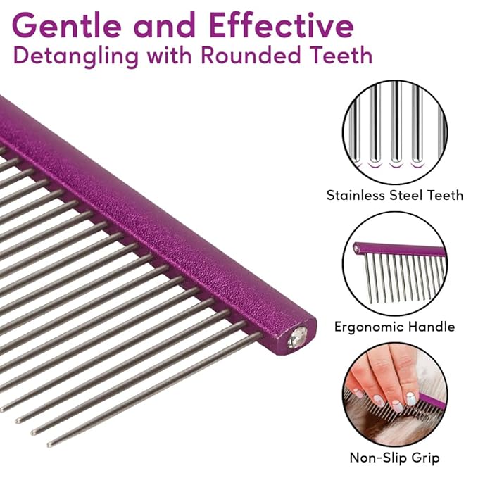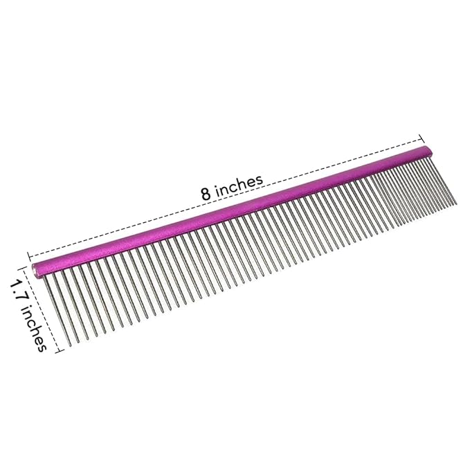 Pet Comb 8 inches Comfortable Grooming Comb with Different-Spaced Rounded Stainless Steel Teeth, Easy Grip and Convenient Grooming for Pets Dog Cat with Medium Coarse Fur - Purple