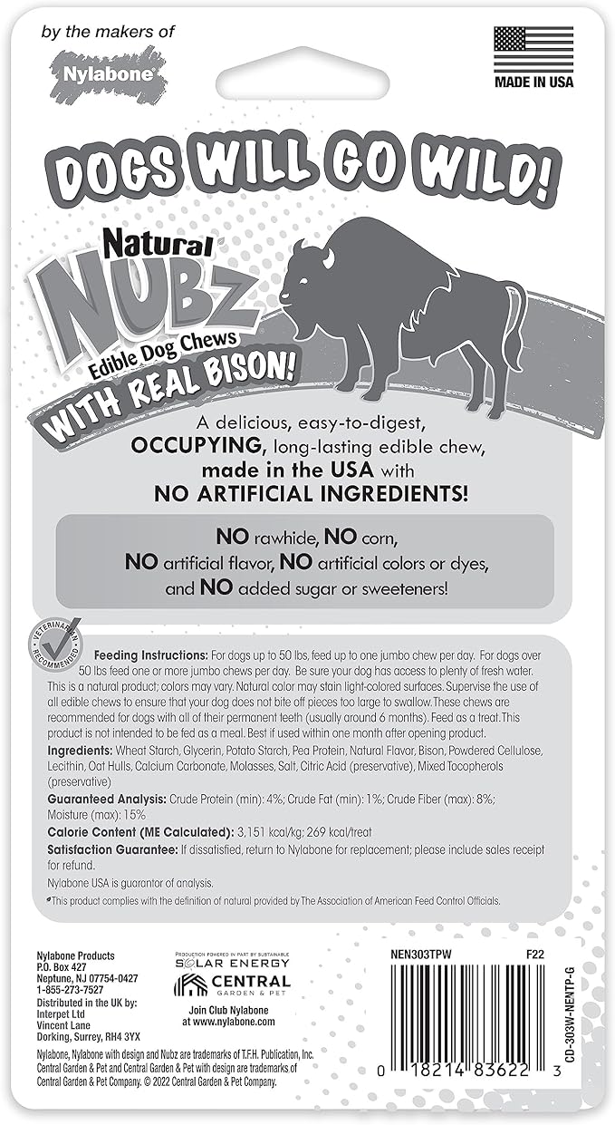 Nylabone Nubz Wild Natural Edible Chew Treats for Dogs, Made in USA, Bison Flavor, Large - Up to 50 lbs. (2 Count)
