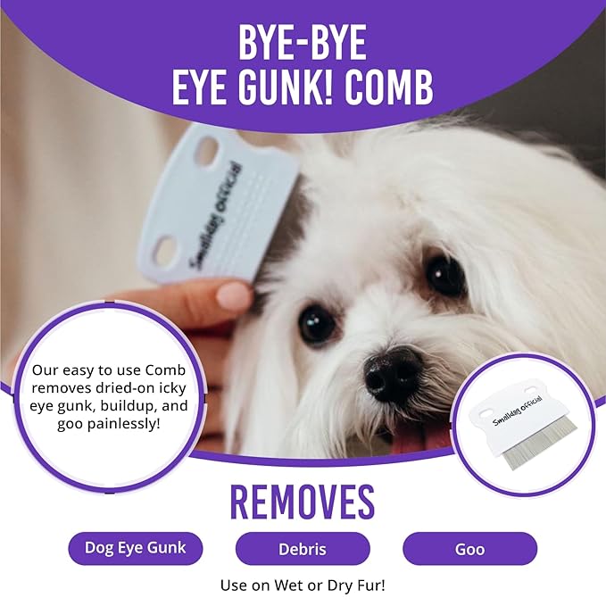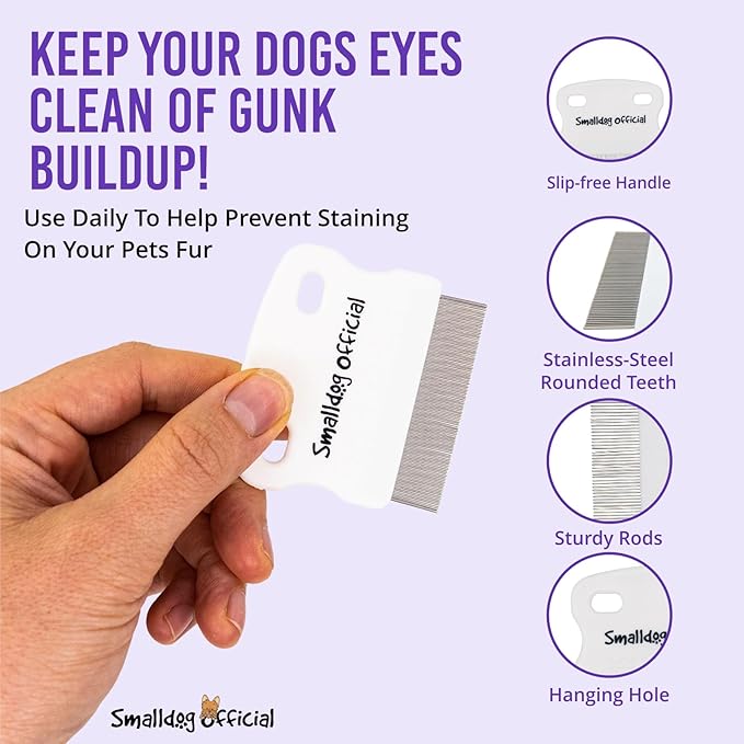 - GOODBYE GUNK: This dog eye comb from SmallDog Official spells the end of eye gunk. Our dog eye booger remover effortlessly glides through short and long fur to remove buildup. For people who care about their pets, this tear stain comb for small dogs is the obvious choice