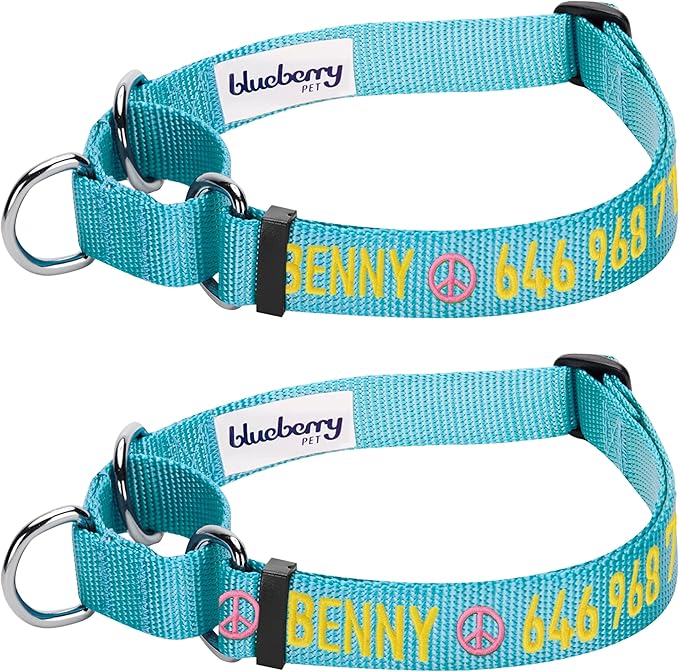 Blueberry Pet Essentials Personalized Martingale Safety Training Dog Collar, Turquoise, Large, Adjustable Customized ID Collars for Dogs Embroidered with Pet Name & Phone Number