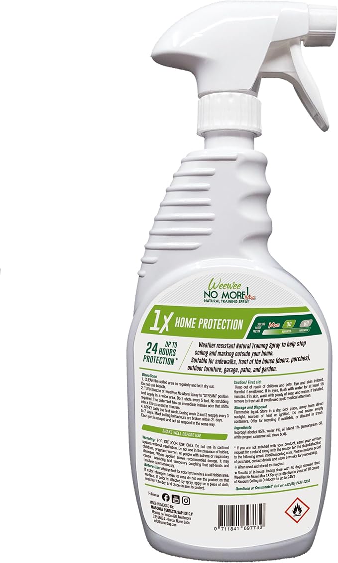- 24 HOURS PROTECTION. WeeWee No More! MAX 1X Training Sprays has a Soiling Proof Factor of thirty (SPF=30). The SPF level indicates the power of a commercial training spray compared to the most frequently used homemade alternatives. An SPF-30 guarantees up to 24 hours° of continuous protection against Dogs Random Soiling in Outdoors. Used by professionals in Condo’s buildings, Gated communities, Hotels, and Sports Clubs.