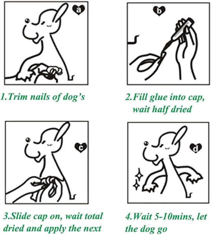 • 【Applying Tips】The dog nail covers home kit are designed for dogs. It’s 2 person’s job. TIPS: 1. Correct size is important. Try one on without glue. If not fit, trim the open of the cap until fit your dog's caps snugly. OR, return for replacement 2. Trim and smooth dog’s nails 3. Make sure that fur are separated with the paw, to avoid sticking together 4. Use a little glue into the cap, not too much, ONLY cover your dog’s nail. More tips, please refer to the Description.
