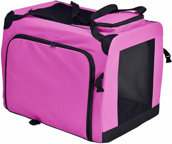 - This Soft Folding Pet Crate features Four sides of Ventilated Mesh with Two Entrances consisting of an Above-Top Mesh Zippered Rooftop and a Zippered Entrance located at the front for convenient pet placement. The Exterior Exterior Shell is composed of Scratch-Resistant Nylon for added Durability
