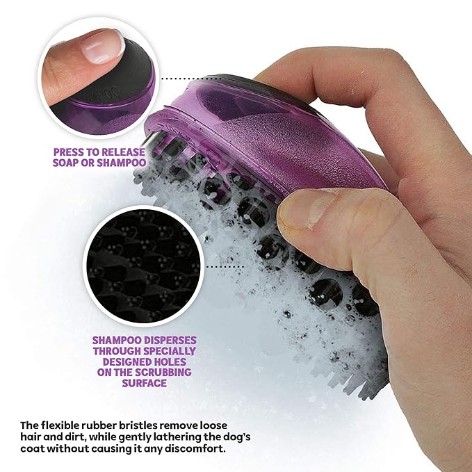 • ADD SHAMPOO INTO THE CAVITY ON THE TOP PART OF THE BRUSH. Stop running around in circles trying to get your dog groomed. Bath time can actually become a fun experience when this dog brush is used. The flexible rubber bristles remove loose hair and dirt, while gently lathering the dog’s coat without causing it any discomfort.