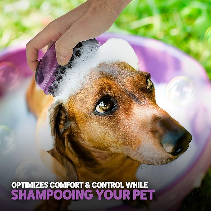 Pet Brush by Poodle Pet |Dog Soap and Shampoo Dispenser for Daily Grooming | Rinses Coat While Removing Lint and Shed Hair |For Short or Medium Hair | Soft Rubber Bristles Gentle on Skin | Purple