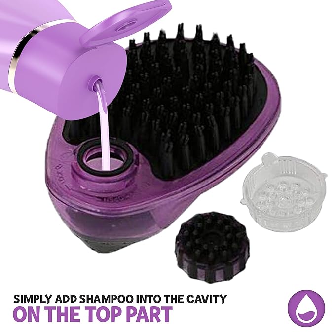 - ADD SHAMPOO INTO THE CAVITY ON THE TOP PART OF THE BRUSH. Stop running around in circles trying to get your dog groomed. Bath time can actually become a fun experience when this dog brush is used. The flexible rubber bristles remove loose hair and dirt, while gently lathering the dog’s coat without causing it any discomfort.