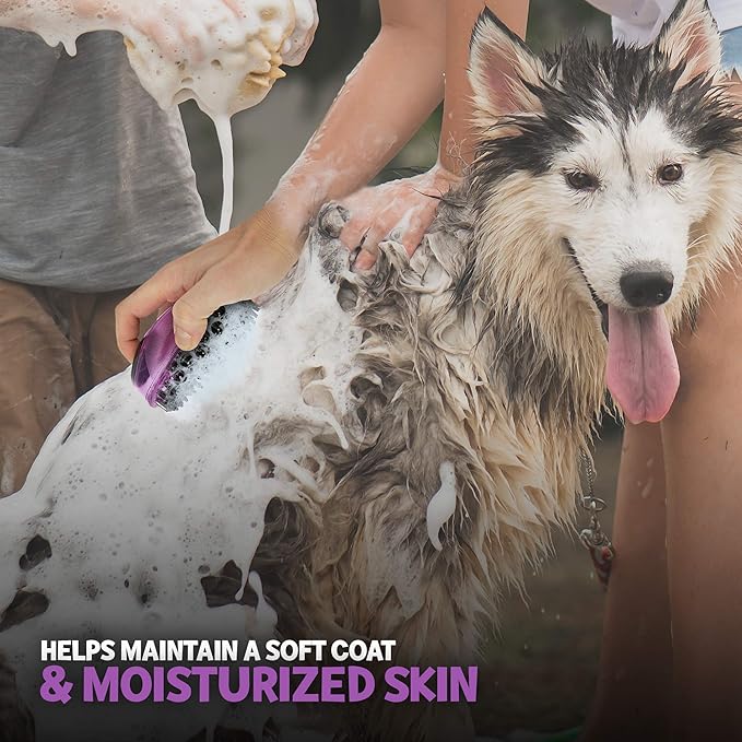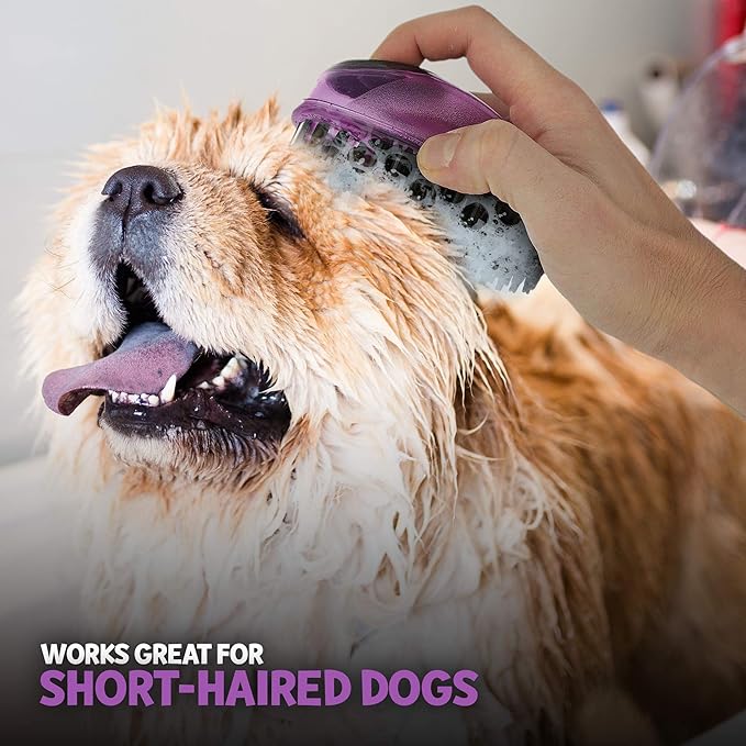 Pet Brush by Poodle Pet |Dog Soap and Shampoo Dispenser for Daily Grooming | Rinses Coat While Removing Lint and Shed Hair |For Short or Medium Hair | Soft Rubber Bristles Gentle on Skin | Purple