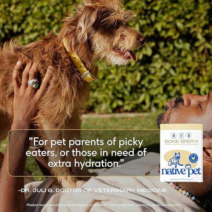 - For Picky Eaters: Got a picky pup? Native Pet chicken bone broth powder is crafted with just three organic ingredients, making it the tastiest topper for even the fussiest eaters. Simply sprinkle on your dog's kibble. It's also great for cats!