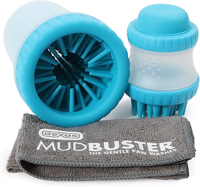 Dexas MudBuster Portable Pet Cleaning Kit with Dog Paw Washer, Pet Bathing Brush, Microfiber Towel, Small, Blue