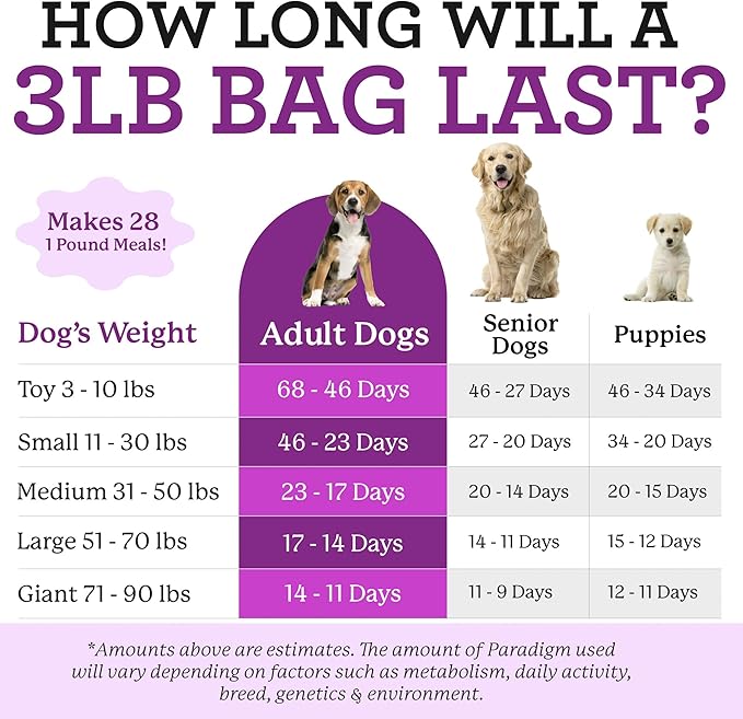 - Paradigm's 3 pound bag conveniently makes 28, one pound finished meals for your canine companion, quantity of meals depend on the weight of your dog