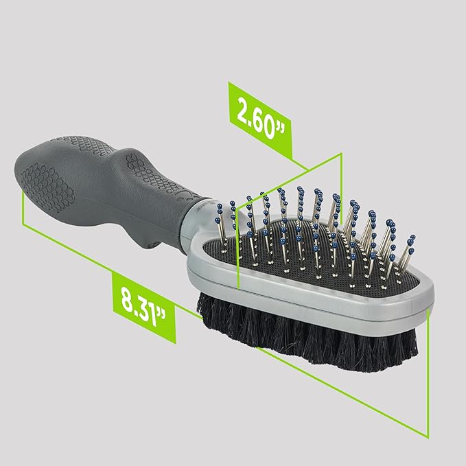 - Dual grooming Brush: durable metal bristles detangle, remove debris and massage the pet’s skin, while boars hair bristles smooth and shine The topcoat.
