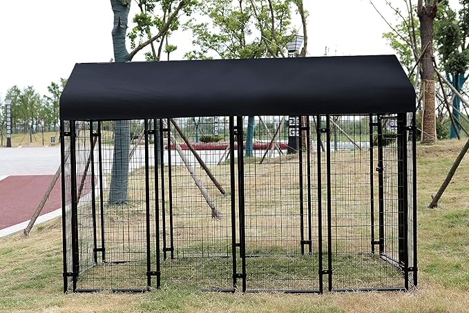 - Large outdoor wire kennel provides a secure pet play area for a canine friend; swing-open door for easy in/out access