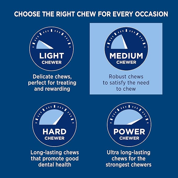 - Premium Medium Strength Chewers: Robust, long lasting chews that satisfy the need to chew, total chew time varies depending on your dog’s breed and enthusiasm