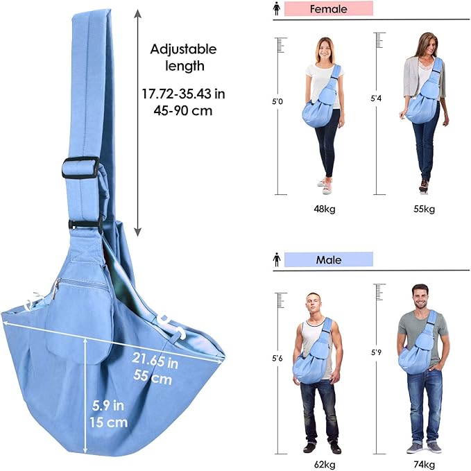 - 【Suitable for Different People】 --- The shoulder strap of this dog purse is adjustable from 17.72 inch to 35.43 inch, which can be customized to the most suitable length for different height. Suitable for small pets weight up to 13lbs, the most suitable weight: 5-12 lbs. For pets weight less than 7lbs, add a light blanket (not included) in the bottom will help support and get pets used to the new shelter.