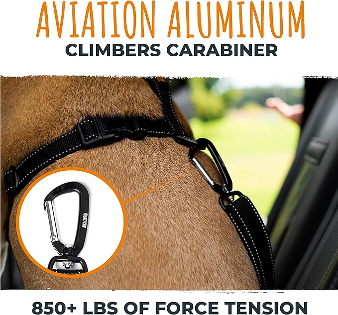 - CARABINER CLIP AND TANGLE-FREE DESIGN: The dog car harness seat belt comes with a carabiner clip made of Aviation Aluminum, capable of withstanding over 850+ lbs of force. Plus our tangle-free swivel attachment keeps your dog from getting tangled up!