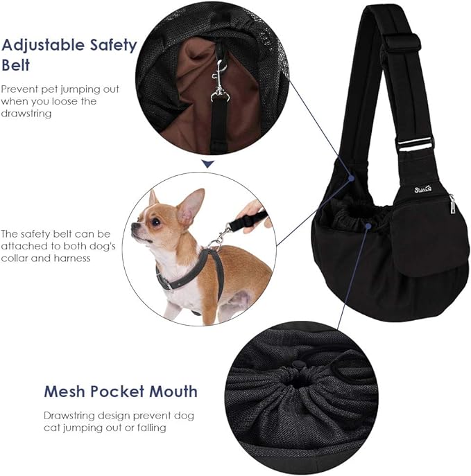 - 【Drawstring Mesh Opening & Safety Hook】--- The drawstring mesh opening is easy to open and offers good control to prevent your pets from jumping out. It can also be adjusted to accommodate different-sized pets, ensuring a comfortable fit. You can gather the mesh around your pet's neck using the drawstring to allow their head to be out. The dog sling shoulder bag also includes an adjustable safety hook that attaches to your pet's collar.