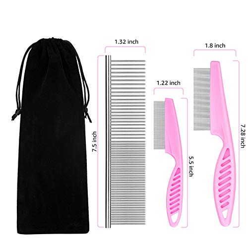 Flea Comb for Cats Dog Comb Lice Comb Metal Teeth Durable Tear Stain Dog Combs Remove Float Hair Combing Tangled Hair Dandruff Pet Comb Grooming Set 3 Pieces Add Storage Pouch (Pink)
