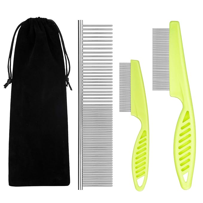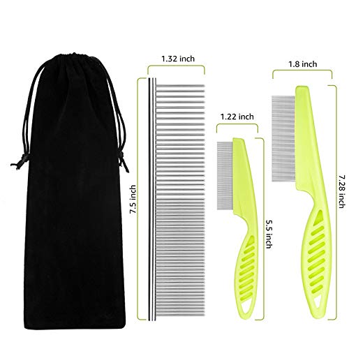 Flea Comb for Cats Dog Comb Lice Comb Metal Teeth Durable Tear Stain Dog Combs Remove Float Hair Combing Tangled Hair Dandruff Pet Comb Grooming Set 3 Pieces Add Storage Pouch (Green)