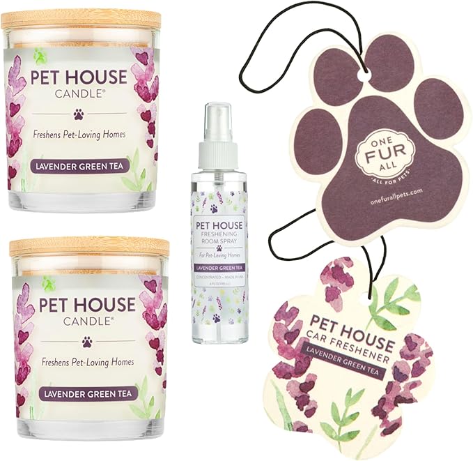 One Fur All Value Pack, Pet Friendly Candles, Room Spray and Car Air Freshener, Long Lasting Plant-Based Pet Odor Candles for Home - Lavender Green Tea