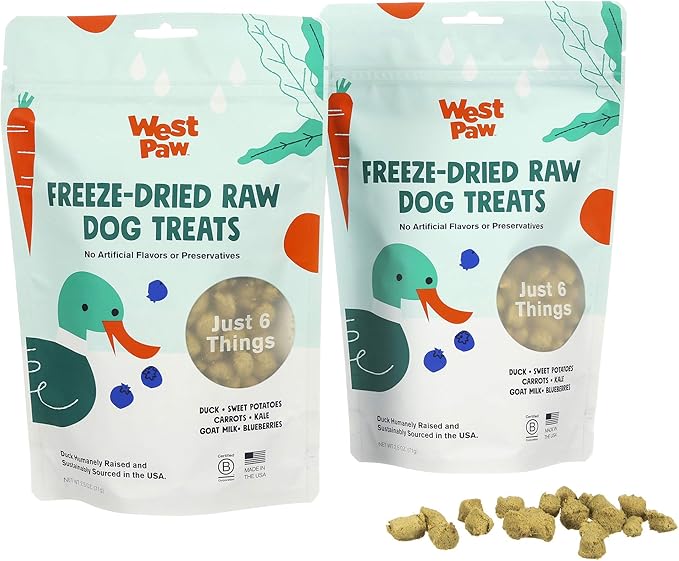 - HEALTHY, ALL-NATURAL DOG TREATS: Keep your small puppy or senior dog healthy and satisfied with these West Paw All-Natural Raw Freeze-Dried Dog Treats that are crafted with humanly-raised and sustainably-sourced fresh ingredients such as duck, goat milk and blueberries.