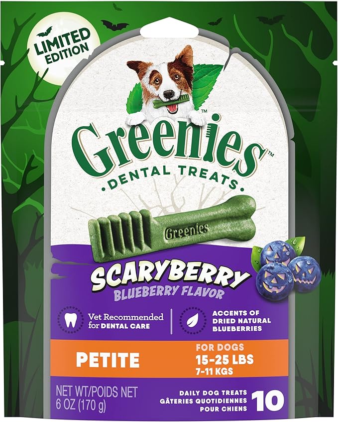 - Contains one (1) 6 oz. pack (10-count) of GREENIES ScaryBerry Blueberry Flavor Halloween Natural Dental Dog Chew Treats Plus Vitamins, Minerals, & Nutrients