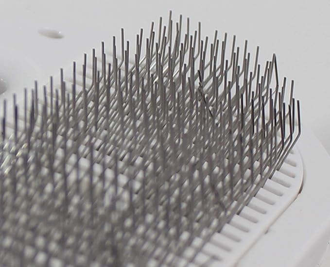 - SELF-CLEANING: With the push of a button, the surface underneath the brush’s stainless steel bristles raises, thus pushing up the furry collection of hair and debris for easy removal. You no longer have to fight and fiddle with bristles! Simply push the button, and voila, it’s in the palm of your hand!