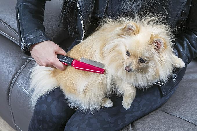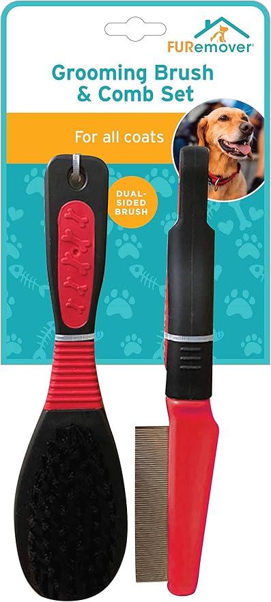 FURemover Grooming Brush & Comb Set, Suitable for All Coats, Includes One Flea Comb and One Dual-Sided Brush with Soft Bristles and Rounded Pins, Black and Red (1208A12-AMZ)