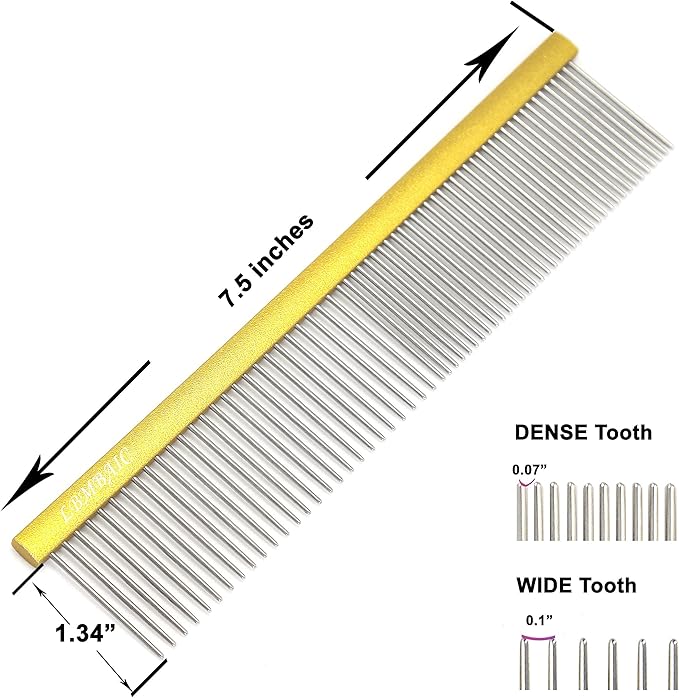 - 【Double-Sided Grooming.70%-80% Efficient Removing Tangles,Knots and Brushing Matted Fur.】>>Coarse Comb wide Tooth: our metal dogs and cats comb can be used for large areas grooming or brushing for tangled hair combing.The back, the tail, the limbs. Finer Comb long Tooth: Great for detailing and deshedding small areas around the face,make it look smoother and cleaner.It's Professional pet comb with fine tooth.
