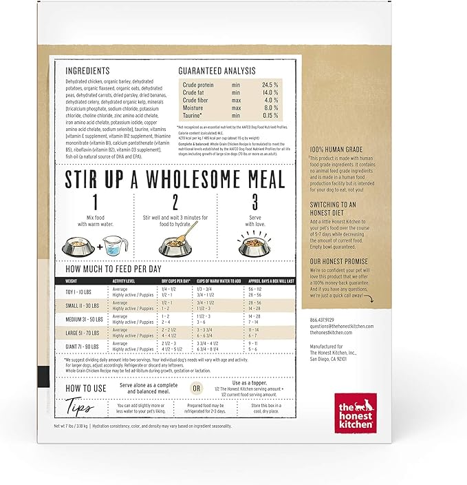 - CAGE FREE CHICKEN & ORGANIC WHOLE GRAINS: The Honest Kitchen Whole Grain Chicken dog food is made with real whole food ingredients like cage free chicken, organic oats, carrots & bananas, which are gently dehydrated for maximum flavor & nutrient retention and easy digestion.
