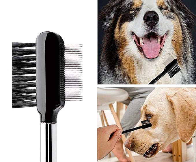 - Double-sided design: Different sides can easily meet most of your needs, use the soft side to trim the pet's hair and use the stainless steel side to remove the tears marks, crusts and mucus around the dog's eyes to make them look clean.