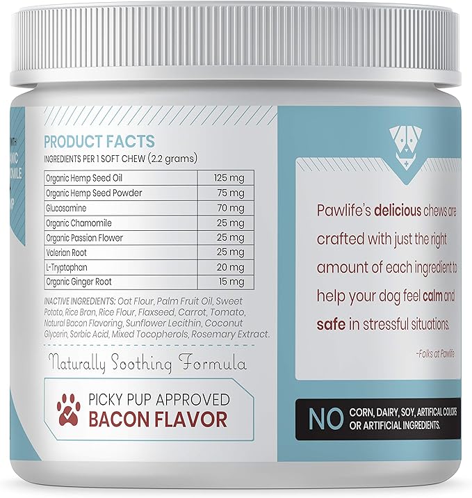 - All-Natural Ingredients - These bacon flavored calming dog treats are free of corn, dairy, soy, and artificial ingredients, allowing your pet a safe way to find relief from anxiety or joint pain.