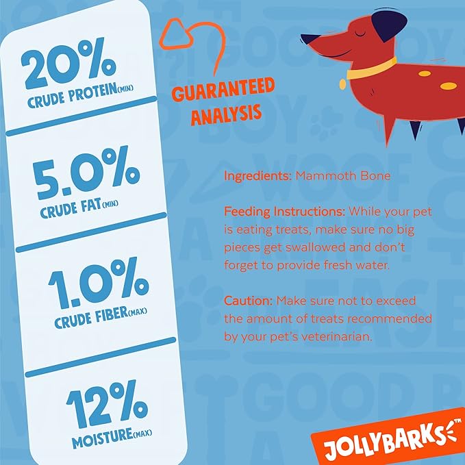 - Vitamins and Minerals - Jolly Barks natural dog bones are packed with essential vitamins and minerals to keep your dog fit and healthy. Each large dog bone contain naturally occurring omega-3 fatty acids, protein, calcium, iron, phosphorus, zinc, selenium, magnesium and manganese.