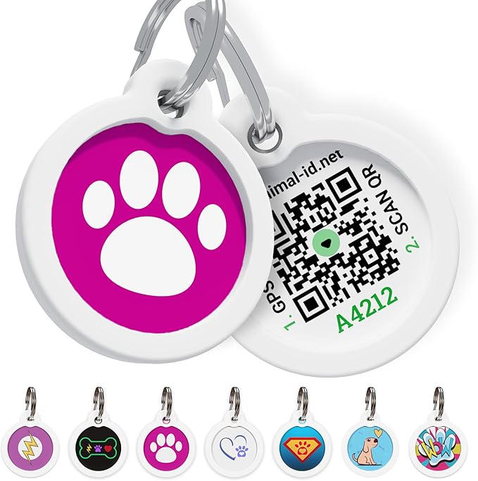 - [MATERIALS]: Pet tag is the best choice for your four-legged friend! This tag is made of stainless steel Coating with Heavy duty polymer with UV High Separation Printing. Nontoxic Rubber silenter is added for the comfort. You can choose QR tags in bright colorful designs. Our dog id tag has two shape: classic round and bone.