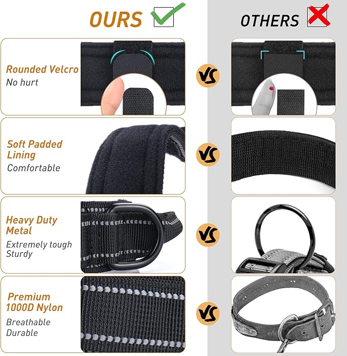 - Premium Material Dog Collar: Tactical dog collars is made of 1000D high-quality nylon fabric and rust-proof metal fittings,very durable, wear-resisting. Soft and comfortable padded inner won’t hurt dog’s fur and can protect dog’s neck well. Dog collars for large dogs can withstand 397-661 pounds of pulling force.