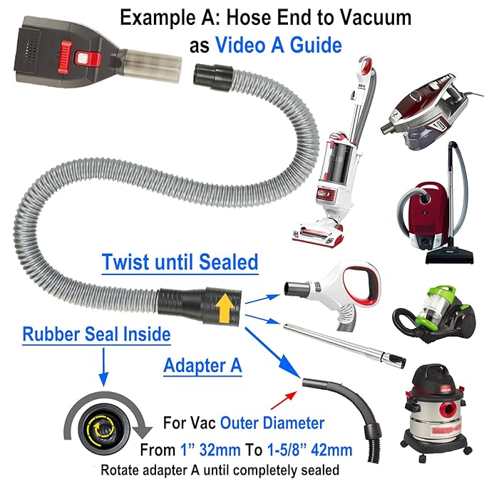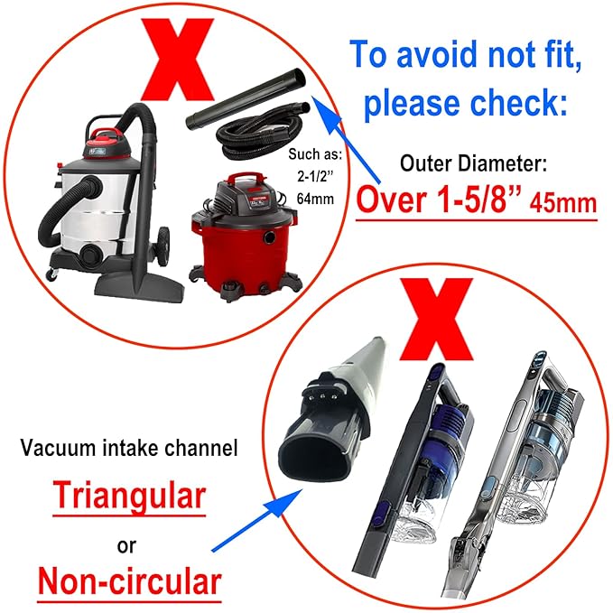 - Wide Compatibility: Fit most brands (Shark/Bissell/Miele/Hoover/DirtDevil/Eureka/Shop-Vac/Kirby/Rainbow/Vacmaster...) and types (Upright/Stick/Central/Wet&Dry/Cordless...); Spec. for circular shape handle: 1.Outer Diameter: 1" to 1-5/8", connect adapter A of extension hose directly; 2.Inner Diameter: 1-1/4" to 1-3/4" connect adapter B and A 1"-2" insert depth only); 3.Unsuitable for non-circular or too wide diameter of some wet&dry vacuums (like: 1-7/8", 2-1/2" vacuum system).