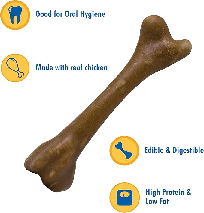 - Chicken flavored chew bone reduces plaque and tartar buildup while your pup chews to her heart’s content.