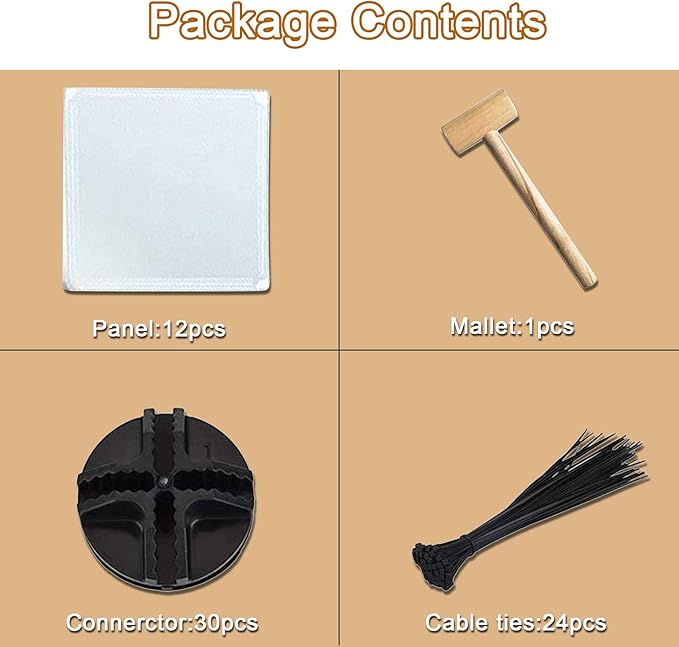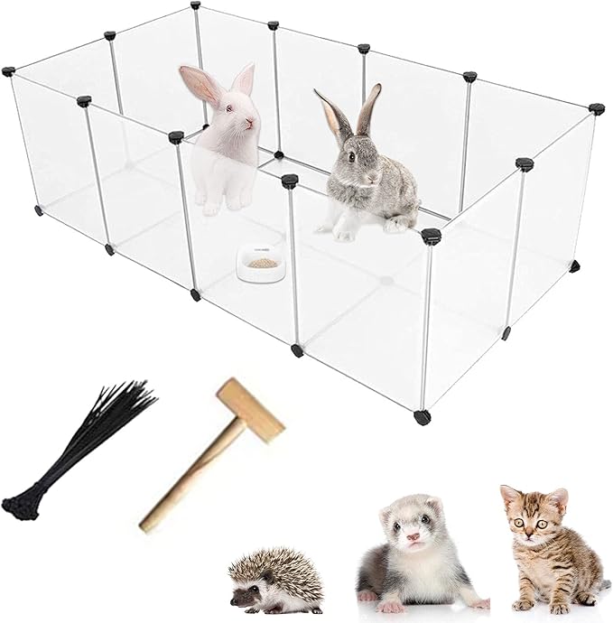 - 【PRODUCT PACKAGE】Rabbit playpen packing:12 x Transparent Panels (13.8 x 13.8inches/35 x 35cm),1 x Wooden Hammer,25 x ABS Connector,12 x Anti-slip Pads,About 30 x Cable Ties.Your Using ABS connectors could form multiple shapes Fence,Pet will have plenty of room for playing and keeping active and exercise.