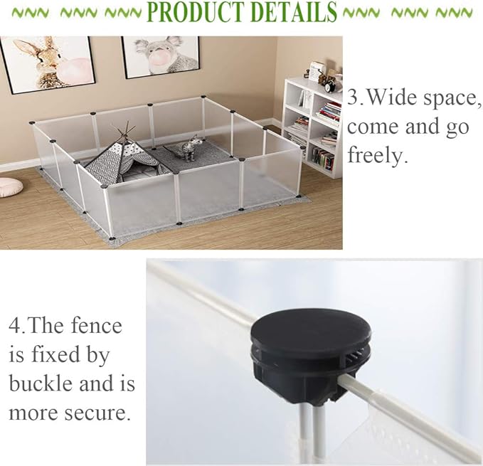- 【EASY CLEAN AND DURABLE】Rabbit playpen are made of upgraded eco-friendly pp resin, Cable ties and fastened together by plastic connectors,movable.Translucent white material for environmentally friendly,small animal enclosure plastic is durable and small rabbit playpen indoor is easy clean.