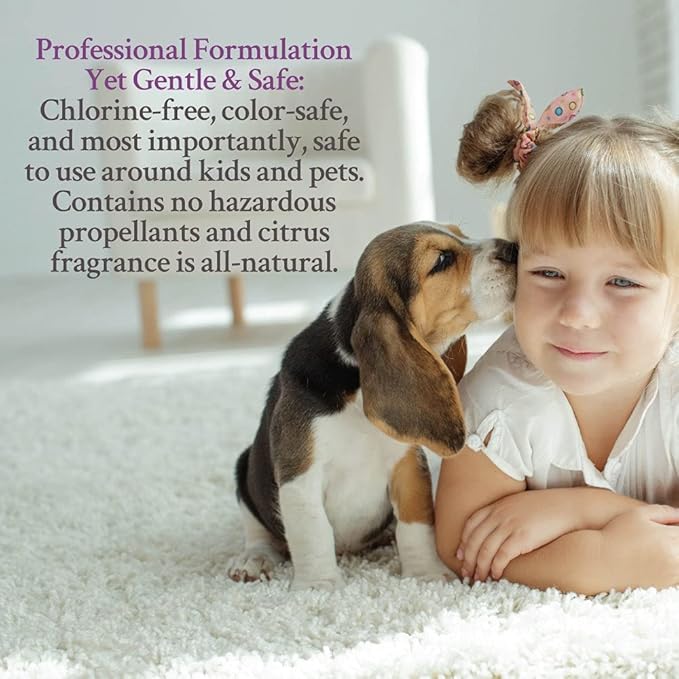 - Professional Formulation Yet Gentle & Safe: Chlorine-free, color-safe, and most importantly, safe to use around kids and pets. Contains no hazardous propellants and citrus fragrance is all-natural.