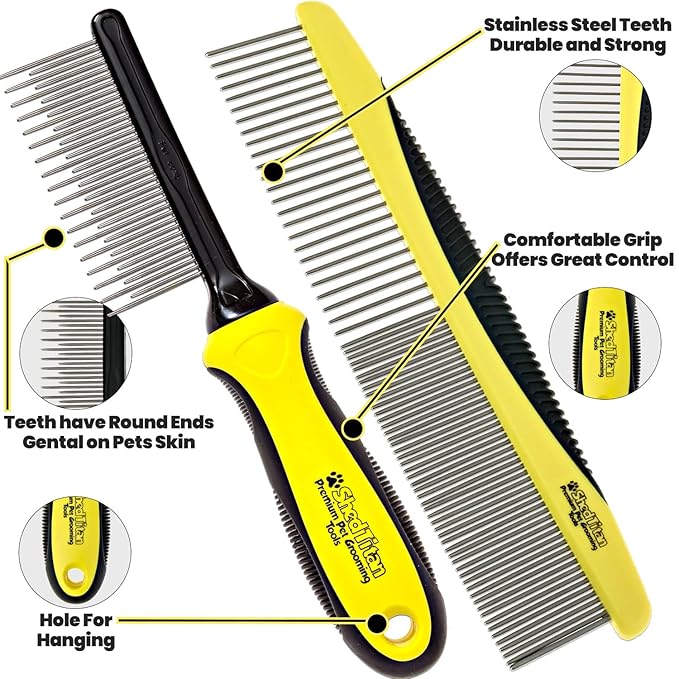 - Dual Pet Grooming Tool Set - Dog and cat grooming supplies, rated 5 barks out of 5! 2 paws way up! Bundle includes a 2-in-1 detangler plus an easy-grip metal comb with coarse and fine teeth. Perfect as a dematting comb for dogs or deshedding tool for cats.