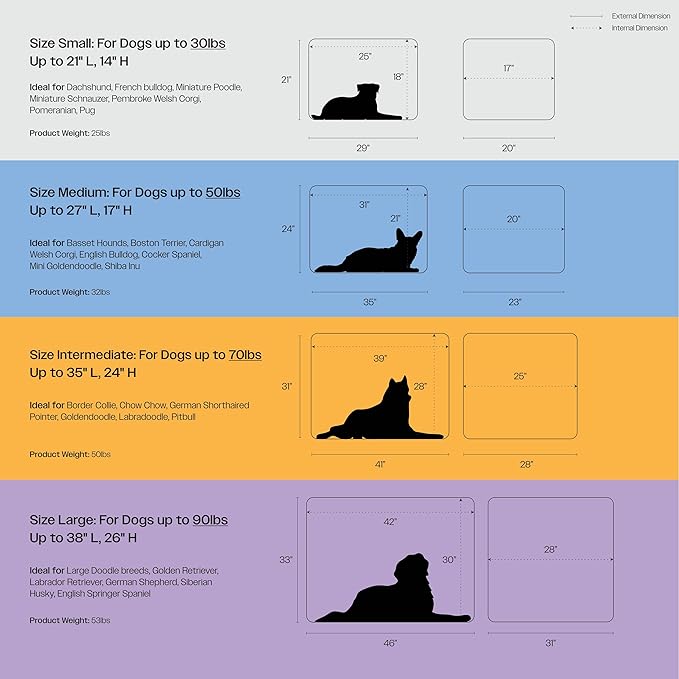 - IS THIS THE RIGHT SIZE FOR MY DOG?: Ideal for dogs up to 20" tall, such as Basset Hounds, Boston Terriers, Cardigan Welsh Corgis, English Bulldogs, Cocker Spaniels, Mini Goldendoodles, and Shiba Inus. Internal dimensions: 32"L x 20"W x 22"H. External dimensions: 35"L x 23"W x 24"H.