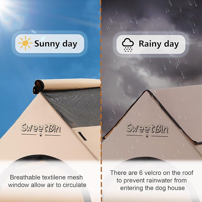 - 【Waterproof Canvas】- There are 2 Air Vents on the pet outdoor shelter,in rainy days, the roof cover can be rolled down and fixed with velcros. Rain proof, thick-woven oxford fabric provides a safe perch for dogs.