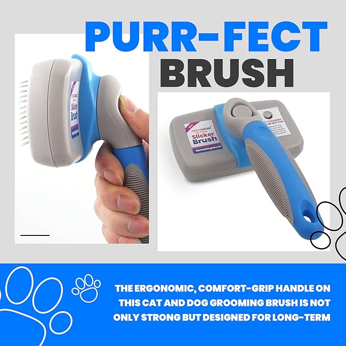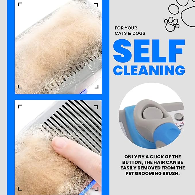 - Self-Cleaning Slicker Brush — Only by a click of the button, the hair can be easily removed from the pet grooming brush. The bristles retract back into the brush, and the hair easily slides off the brush.