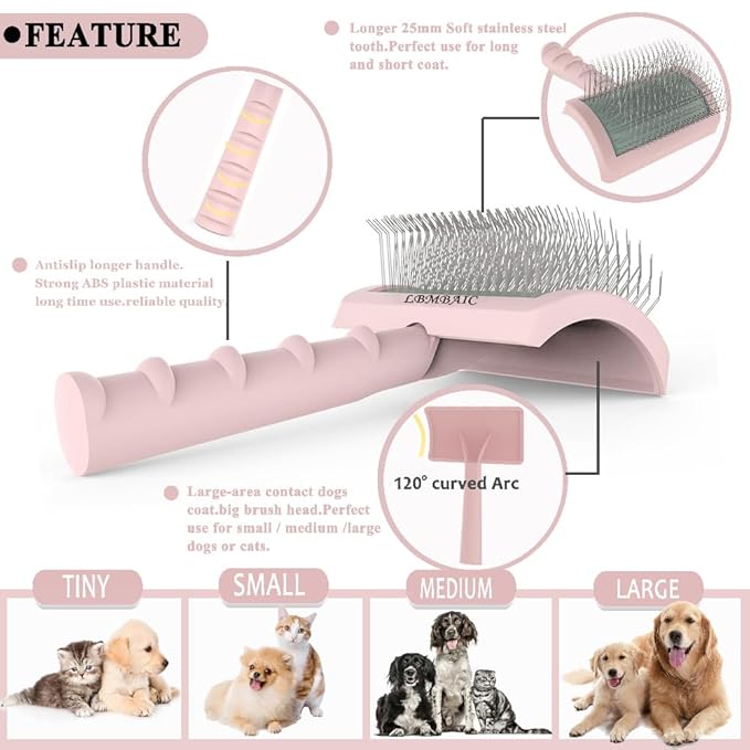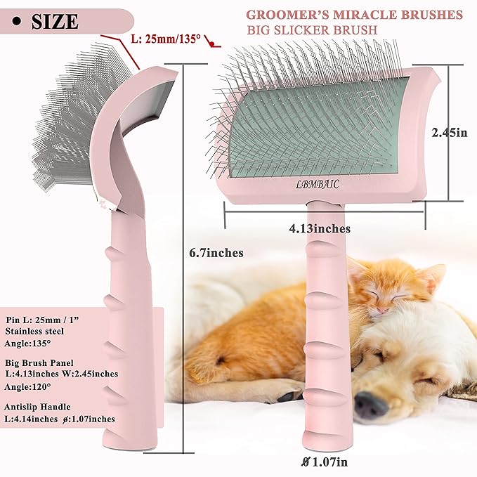 - 【120° Big Unique Curved Handle Design Easier To Use.】- Large contact surface Increase the area of contact with pet hair during grooming.120°curved surface conform to grooming habits save time and energy. Extra long pin slicker brush size is suitable for small medium large dogs or cats with thick or long hair.This multi-purpose slicker brush for loosing undercoat hair long,straight,curly,thick,shaggy.